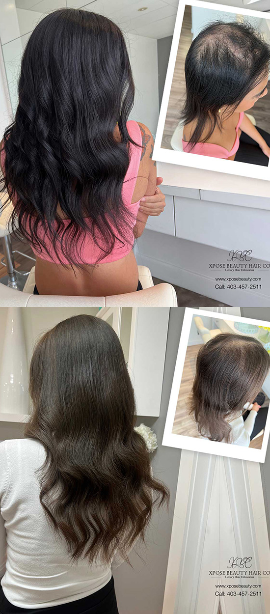 It’s for people experiencing a lower degree of hair loss or less extensive hair loss compared to our other techniques. They can wear extensions for the most part but still dislike seeing the thinning and/or hair loss at the top scalp.